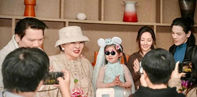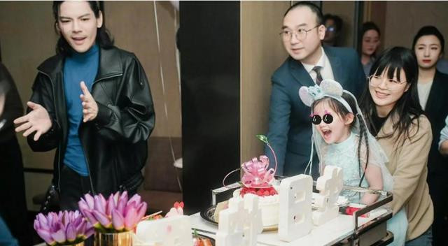 小女儿推着蛋糕进场,穿着公主裙,胖乎乎的模样甚是讨喜。